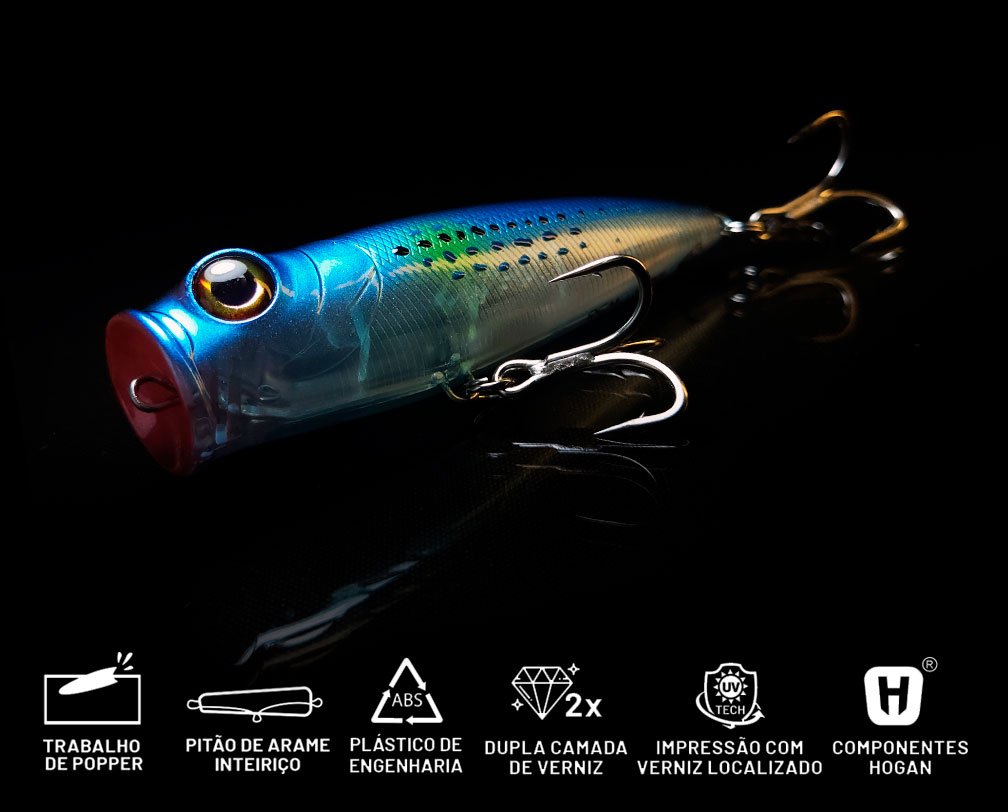 Possui corpo robusto e bem estruturado em plástico ABS, pitões com arame inteiriço interligado, componentes HOGAN de extrema resistência com Split Ring forjado, disponível em 2 tamanhos, 9cm e 10cm.